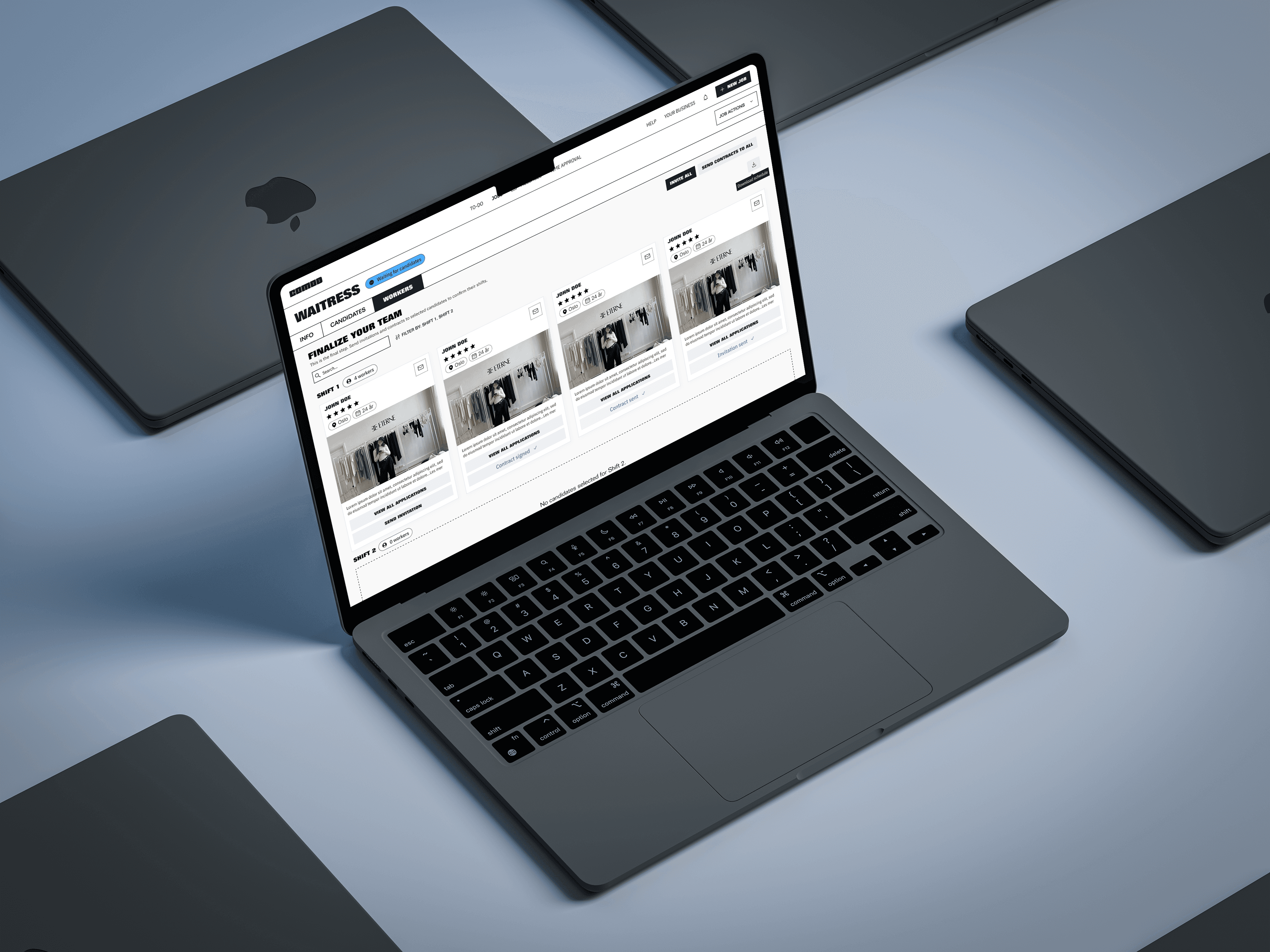 The employer experience focuses on overview and decision-making. Visual density is carefully controlled to allow employers to manage multiple workers and timeframes without losing context.