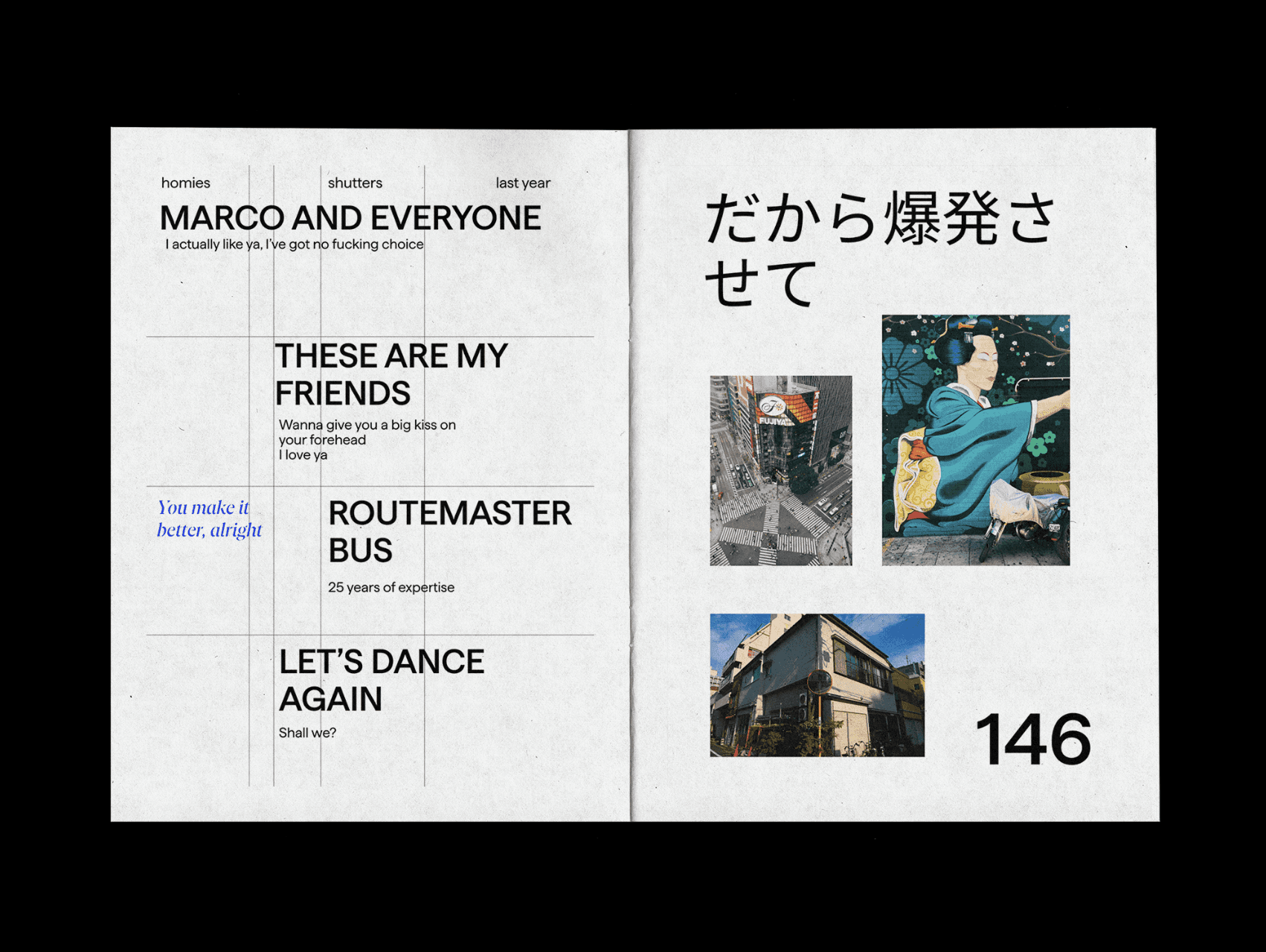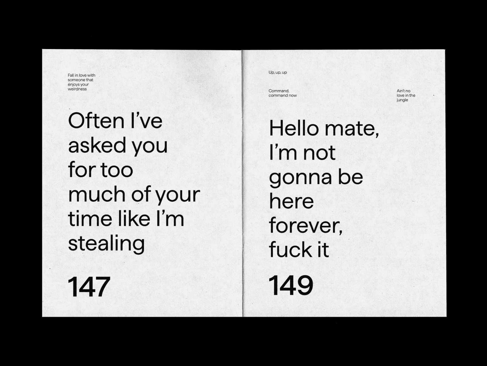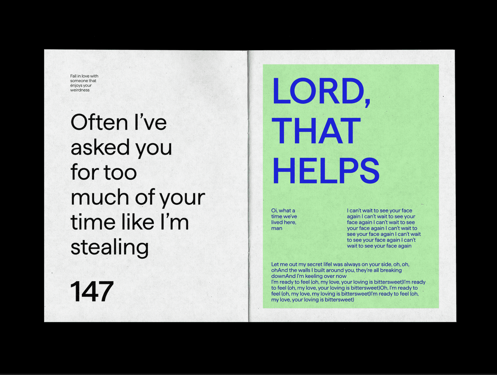 This project is an editorial exploration of intimacy, obsession, and emotional fragmentation, developed as a fictitious fanzine. The publication combines personal writing, song lyrics, found imagery, and typographic rhythm to mirror the unstable, repetitive nature of certain emotional states - especially love as fixation rather than resolution.