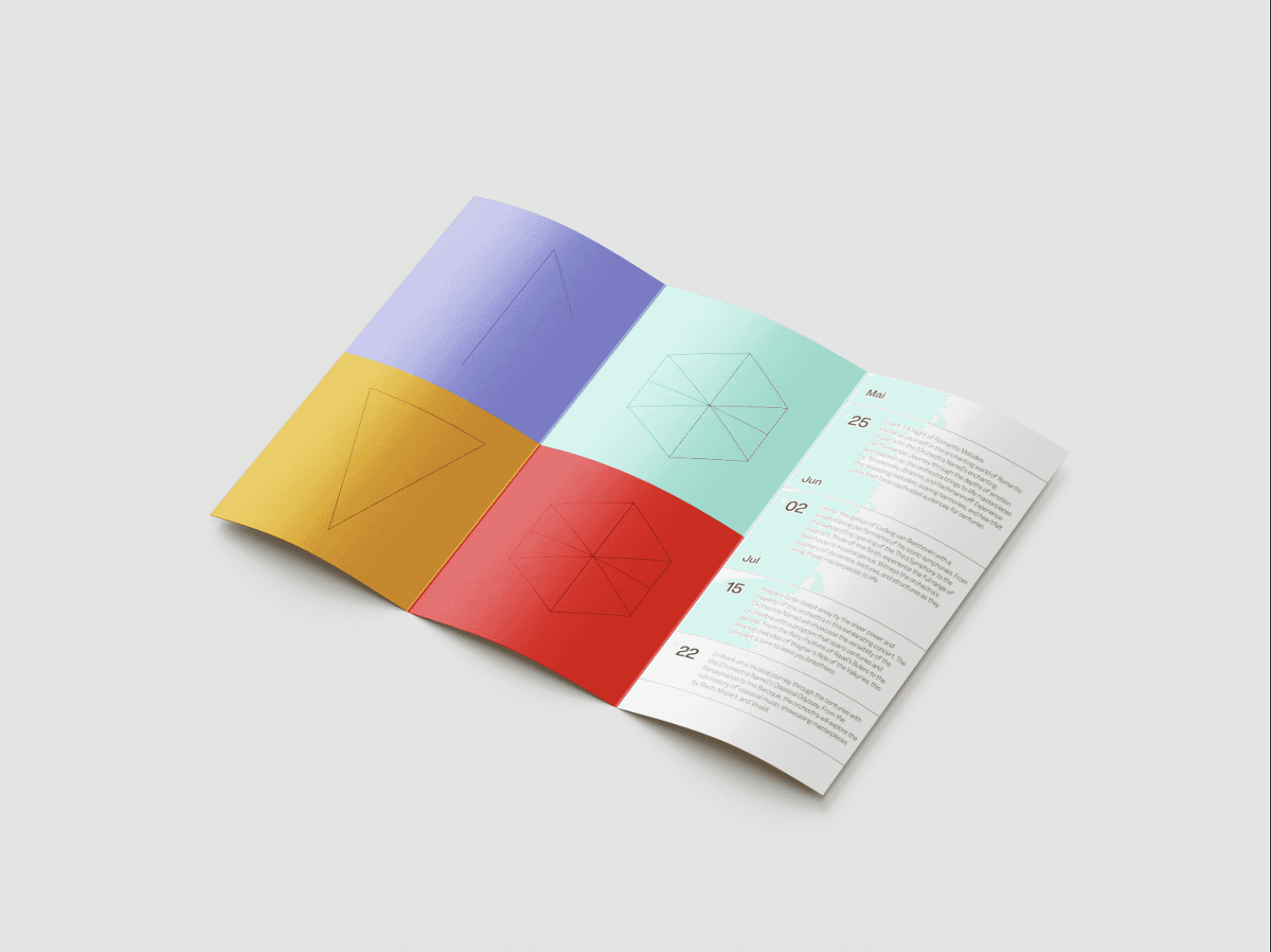 Symphony Season is a fictitious editorial project exploring how a cultural programme can be translated into a clear, modular visual system. The publication is conceived as a seasonal guide for a symphony orchestra, balancing expressive colour with strict structural logic.